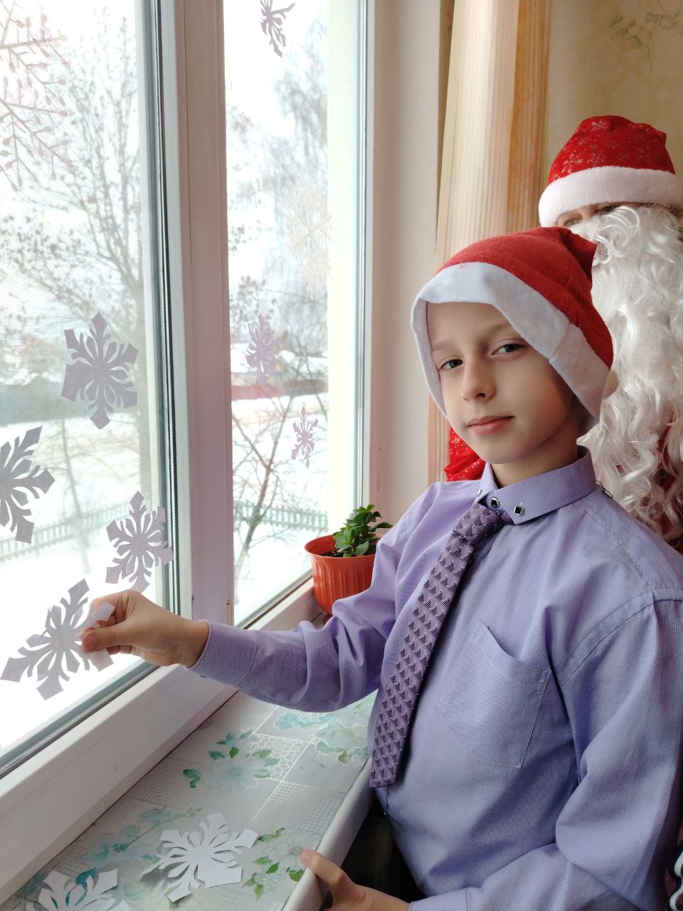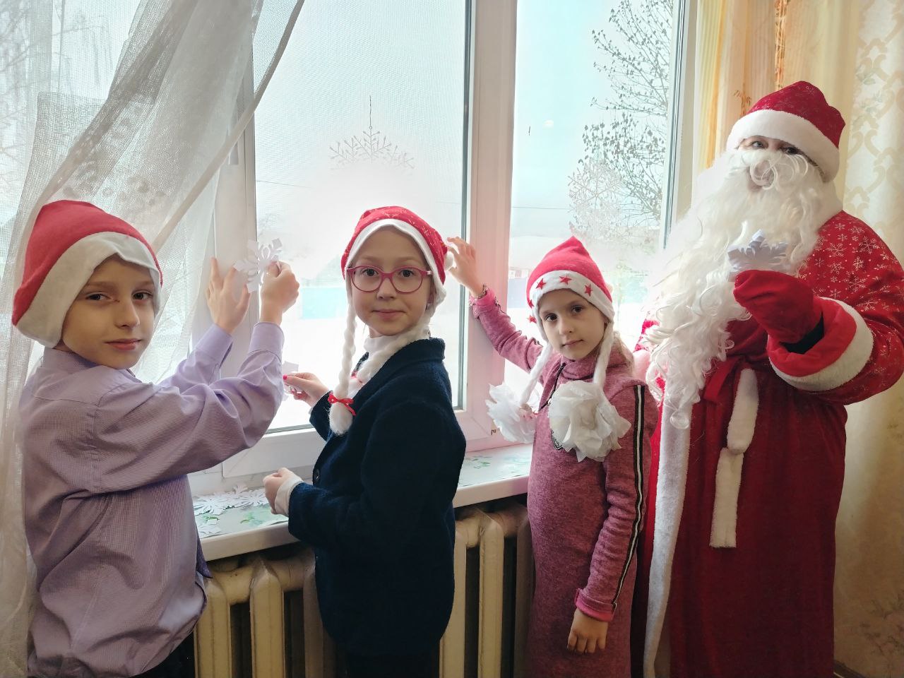 Они поздравили их с наступающими праздниками - Новым годом и Рождеством, вручили им поздравительные открытки, изготовленные своими руками, нарядили елки и украсили окна вытинанками.